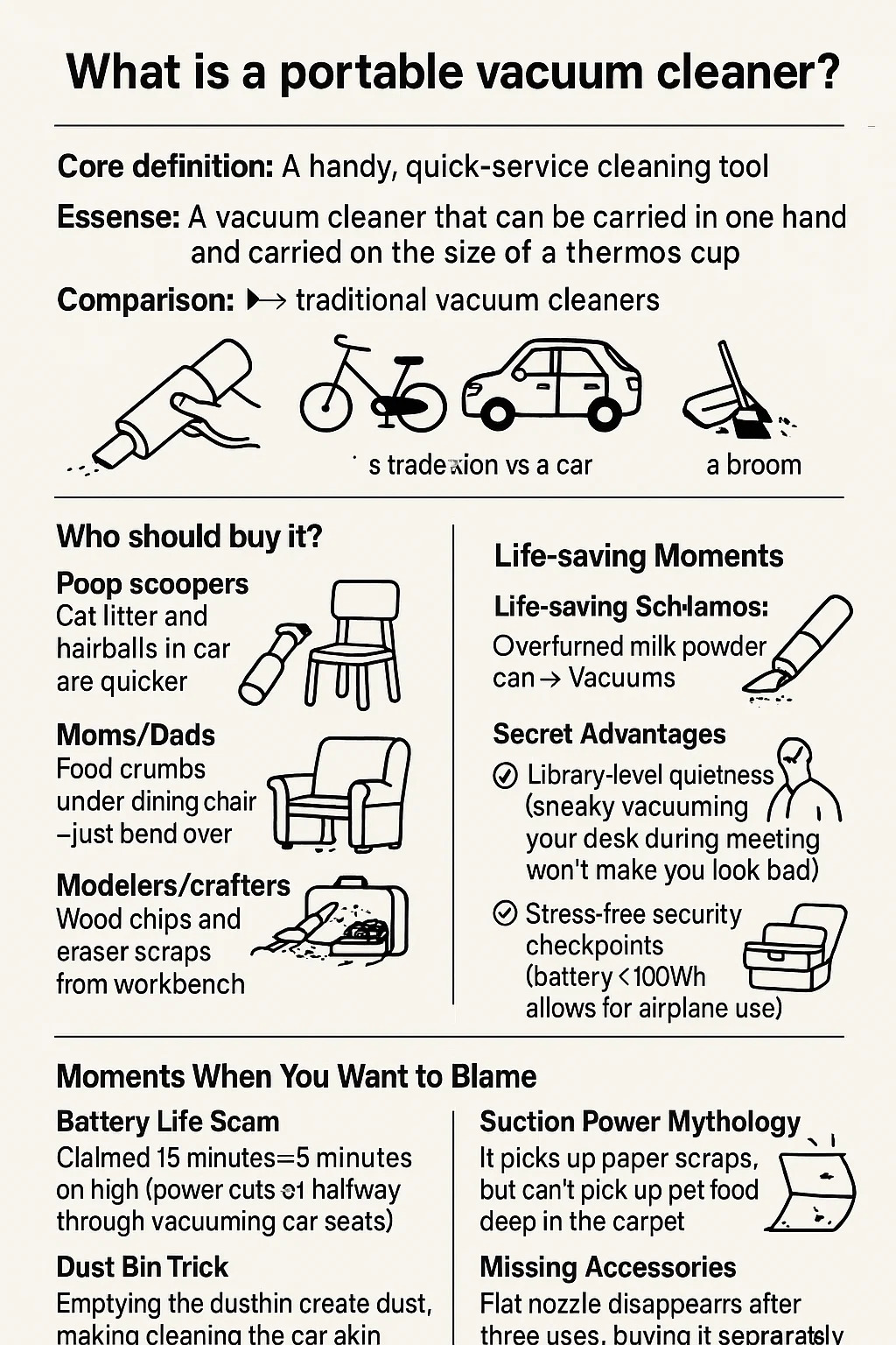 Comparison: ► vs. traditional vacuum cleaners: Like a folding bicycle vs. a car, sacrificing performance for ultimate portability. ► vs. a broom: It's a winner for biscuit crumbs in sofa seams; it's useless for cleaning large areas of floor.
